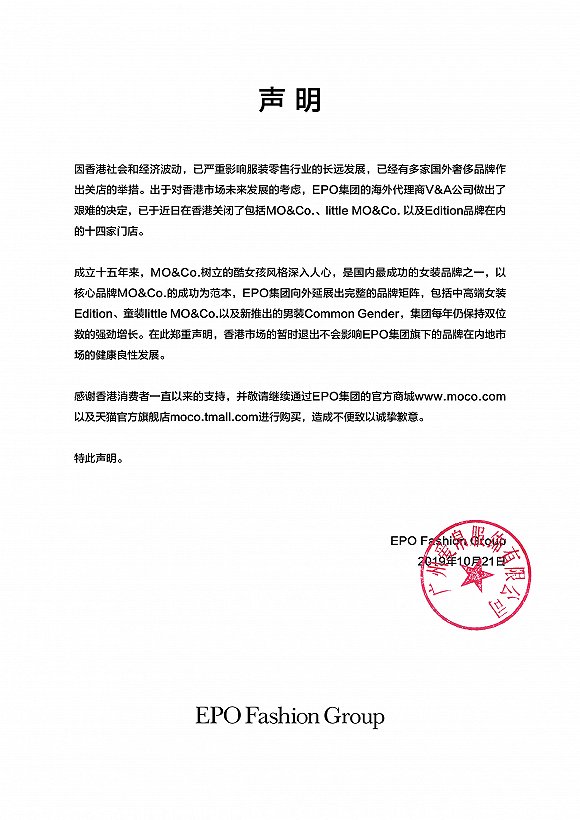 10月21日,有自媒体发布消息称,女装品牌MO&Co. 香港分公司V&A FASHION CO., LIMITED受到近日香港社会和经济波动影响,已破产清算。界面时尚向MO&Co. 母公司EPO集团取得回应。10月21日晚间,EPO集团通过声明表示前述消息不属实。